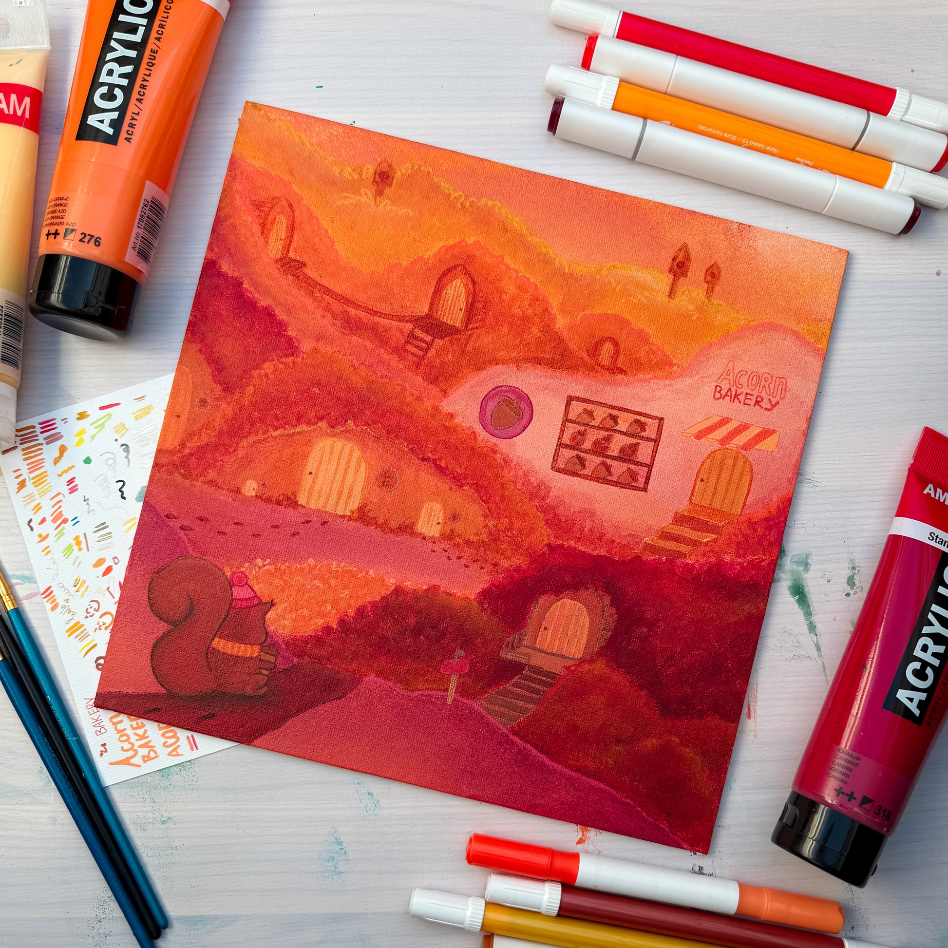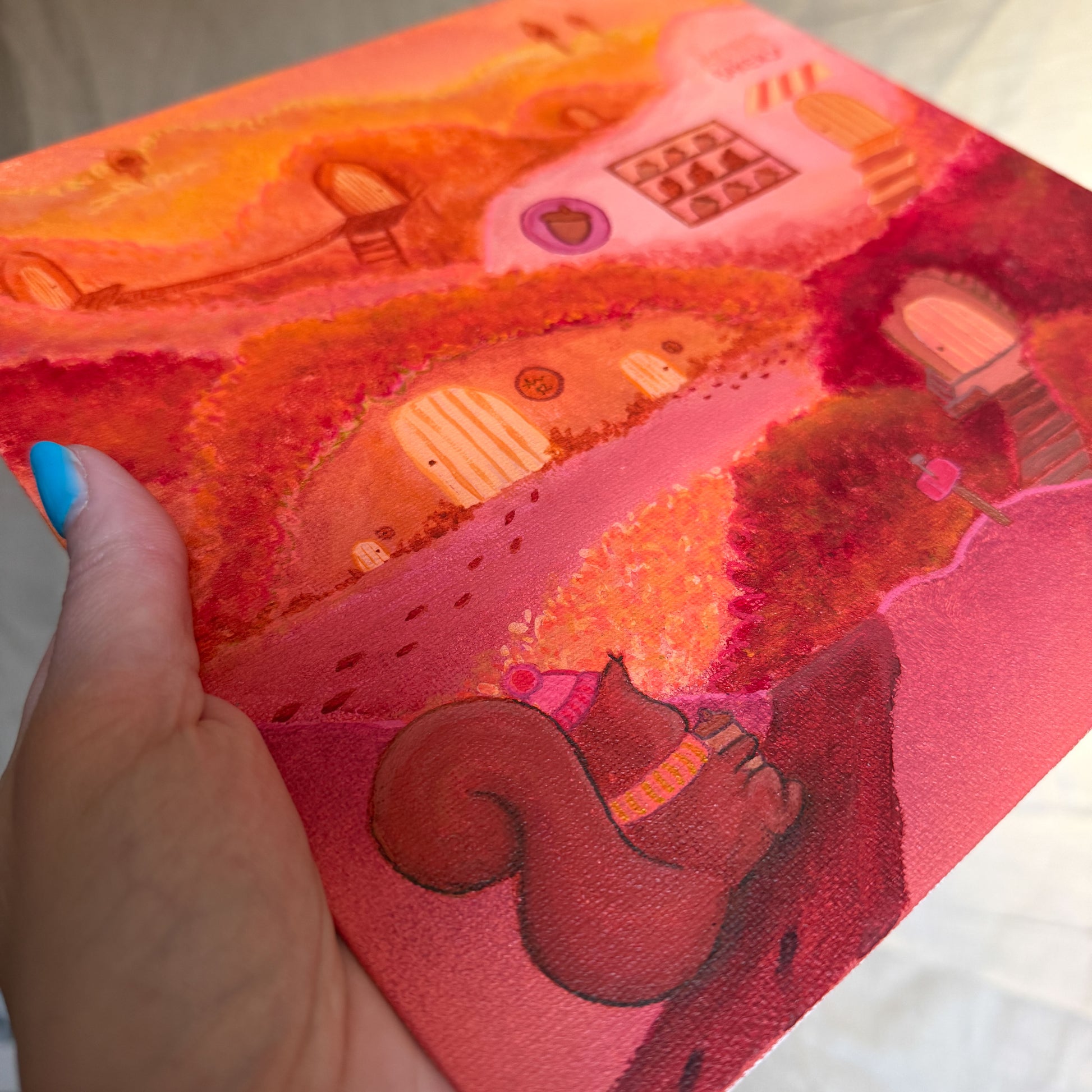 Diep in het bos, tussen goudgele bladeren, liggen schattige eekhoornhuisjes verscholen. Op de voorgrond is een ijverige eekhoorn onderweg naar huis na een bezoekje aan de “Acorn Bakery” – een charmante plek waar eikeltjes worden verkocht worden als de lekkerste lekkernijen. Het verhaalachtige karakter maakt dit schilderij niet alleen een lust voor het oog, maar ook een bron van verbeelding.