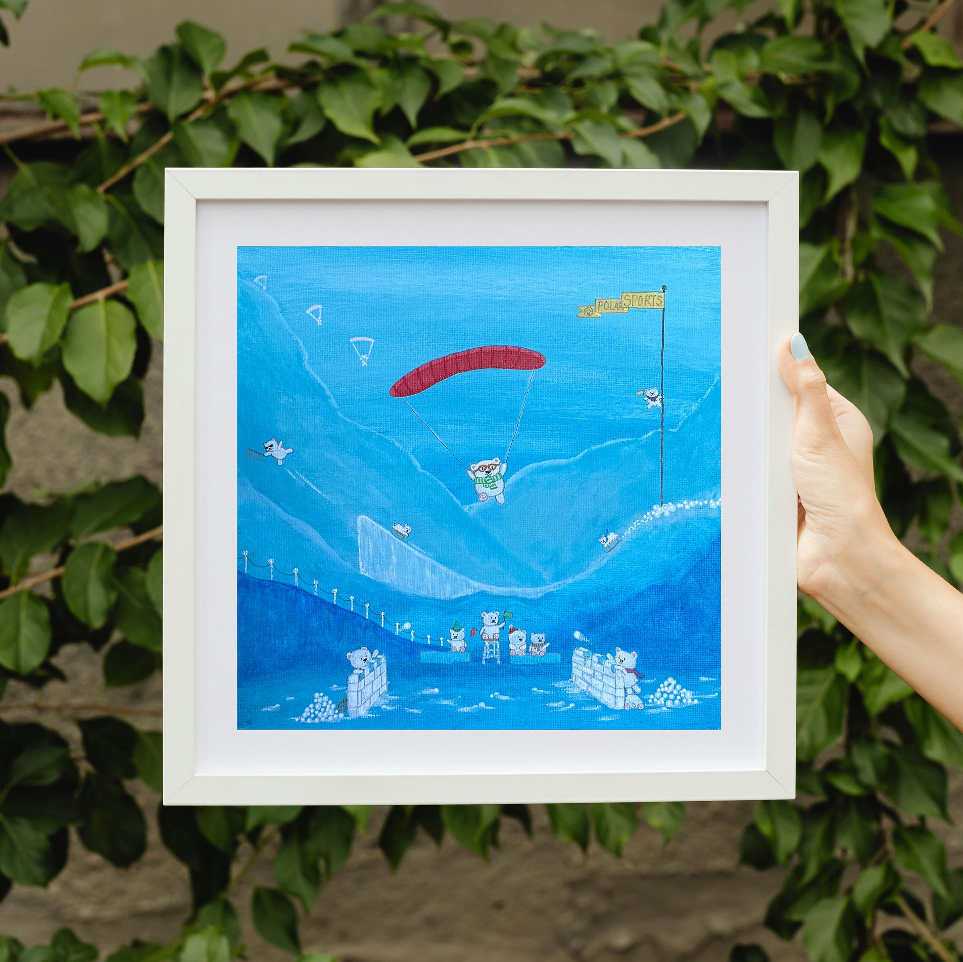 Je ziet ijsberen die vrolijk van de hellingen sleeën, de vlagstok beklimmen en zelfs ijsberen die door de lucht zweven tijdens het paragliden. Alsof dat nog niet genoeg is, barst er ook een serieus sneeuwballengevecht los! Elk detail in dit schilderij nodigt uit om langer te kijken en steeds iets nieuws te ontdekken.